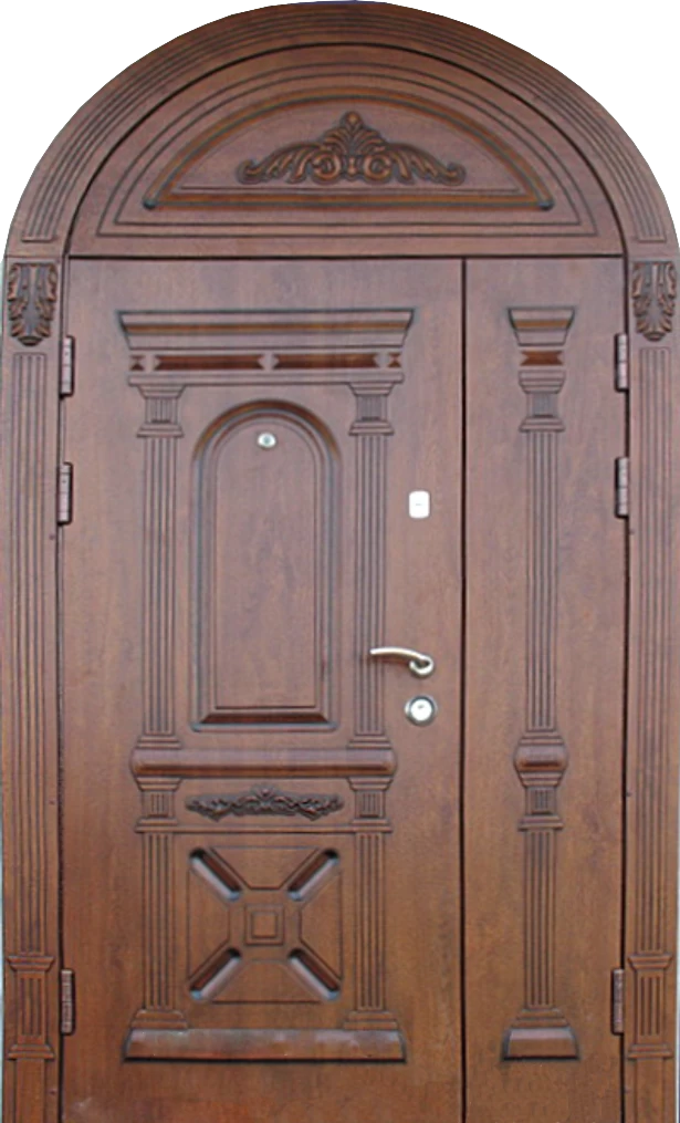 Поскольку в большинстве случаев устанавливаемые на входе в коттедж двустворчатые двери являются еще и предметом интерьера, украшающим здание, их дизайну предается особое значение. Эти двери, как правило, отделываются атмосферостойким МДФ, натуральным шпоном, массивом. Эффектно на таких дверях смотрится витражный узор, применение ковки, зеркальных элементов. Вариантов декора входной двустворчатой двери масса, тут все зависит от пожеланий заказчика.
